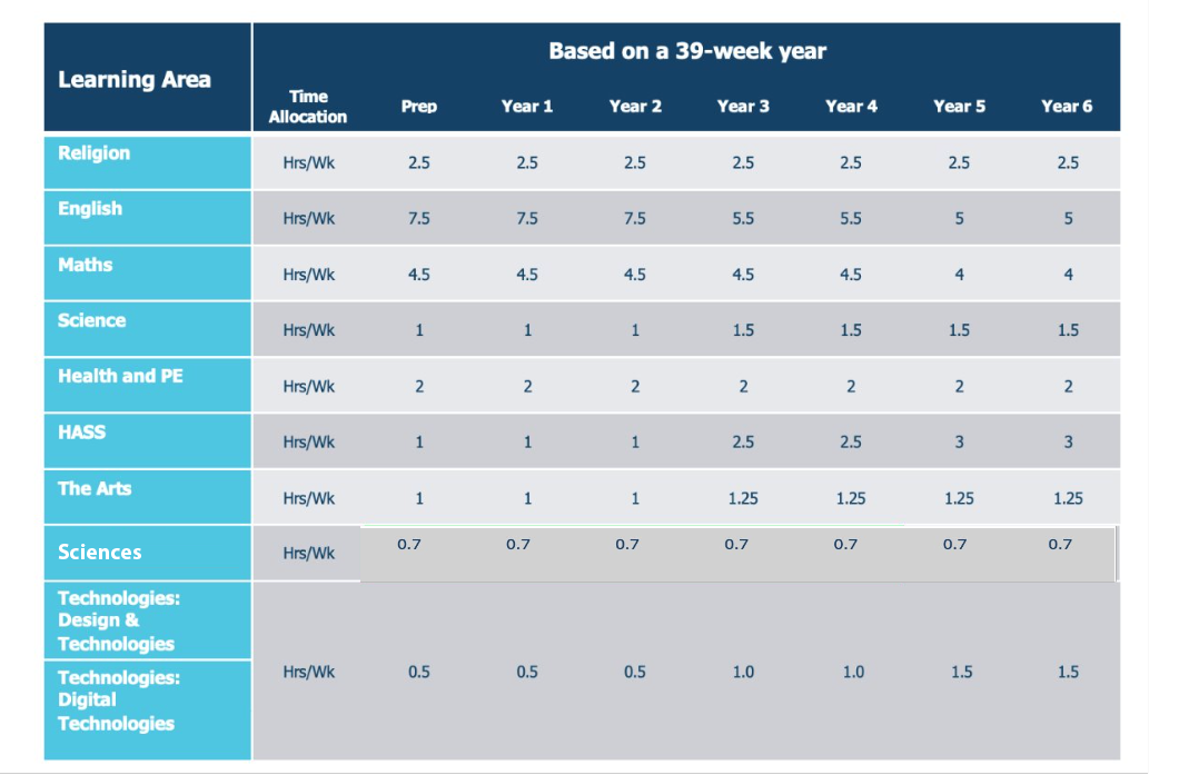The Australian Curriculum and Religion Curriculum guide the time allocations for learning areas. The allocation of time is based on the content of the curriculum and is flexible to suit the local context of schools. Schools may allocate more time to learning areas that are a priority. At Star of the Sea Primary School, specialist teachers in the areas of the Arts, Sciences and HPE provide planning and preparation time, which influences school decisions on time allocations.